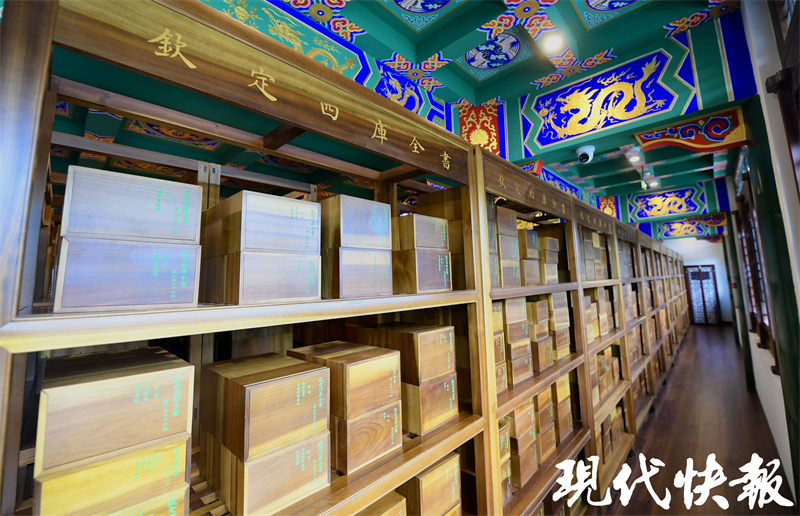 在扬州文汇阁,历时12年复制完成的《四库全书》在记者们的眼前铺陈开来。据了解,文汇阁曾毁于战火,今年4月复建完成并正式开放,《四库全书》重新入藏,时隔169年书与阁再次相逢。