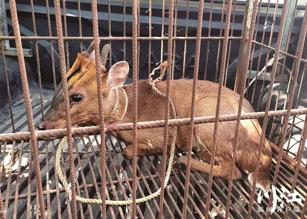 为确保野生动物健康、安全,工作人员采用合围的方式将其捉住并关进铁笼。经叙永县林业和竹业局工作人员鉴定,确认这是一只国家“三有”保护动物——小麂。