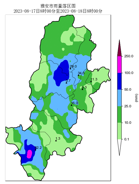 2023年8月17日8时至18日8时,雅安市降雨情况