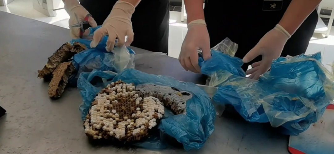 近日,昆明海关所属天保海关关员在天保口岸旅检通道开展监管时,发现1名从“无申报通道”进境的旅客腿部、腰部臃肿,步态异常。经拦截检查,关员发现其双腿、腰部捆绑着大小不一用塑料袋密封的带巢蜂蛹,共4袋、1.295千克。