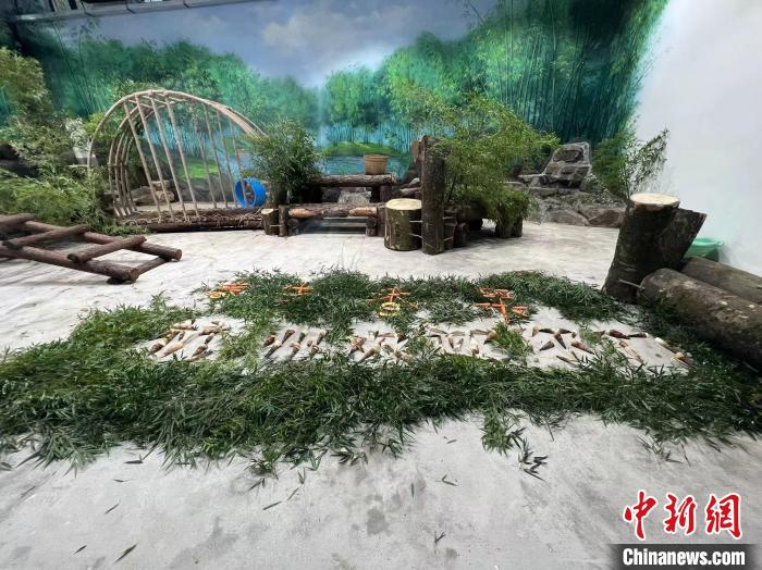 当天开馆前,杭州动物园的保育员们早早地在室内活动场馆搭建起了竹筒“蛋糕”,并铺上了大熊猫喜爱的竹笋、南瓜等。而在场馆另一侧,保育员们还特意用新鲜竹叶、竹笋、胡萝卜和南瓜拼出了“春生香果,杭州欢迎你们”的字样。