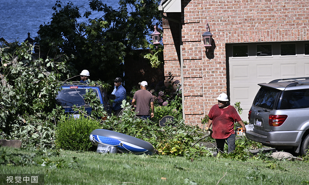当地时间2023年8月8日,美国北卡罗来纳州,猛烈的暴风雨过后,居民清理地面倒塌的树木。(图:视觉中国)