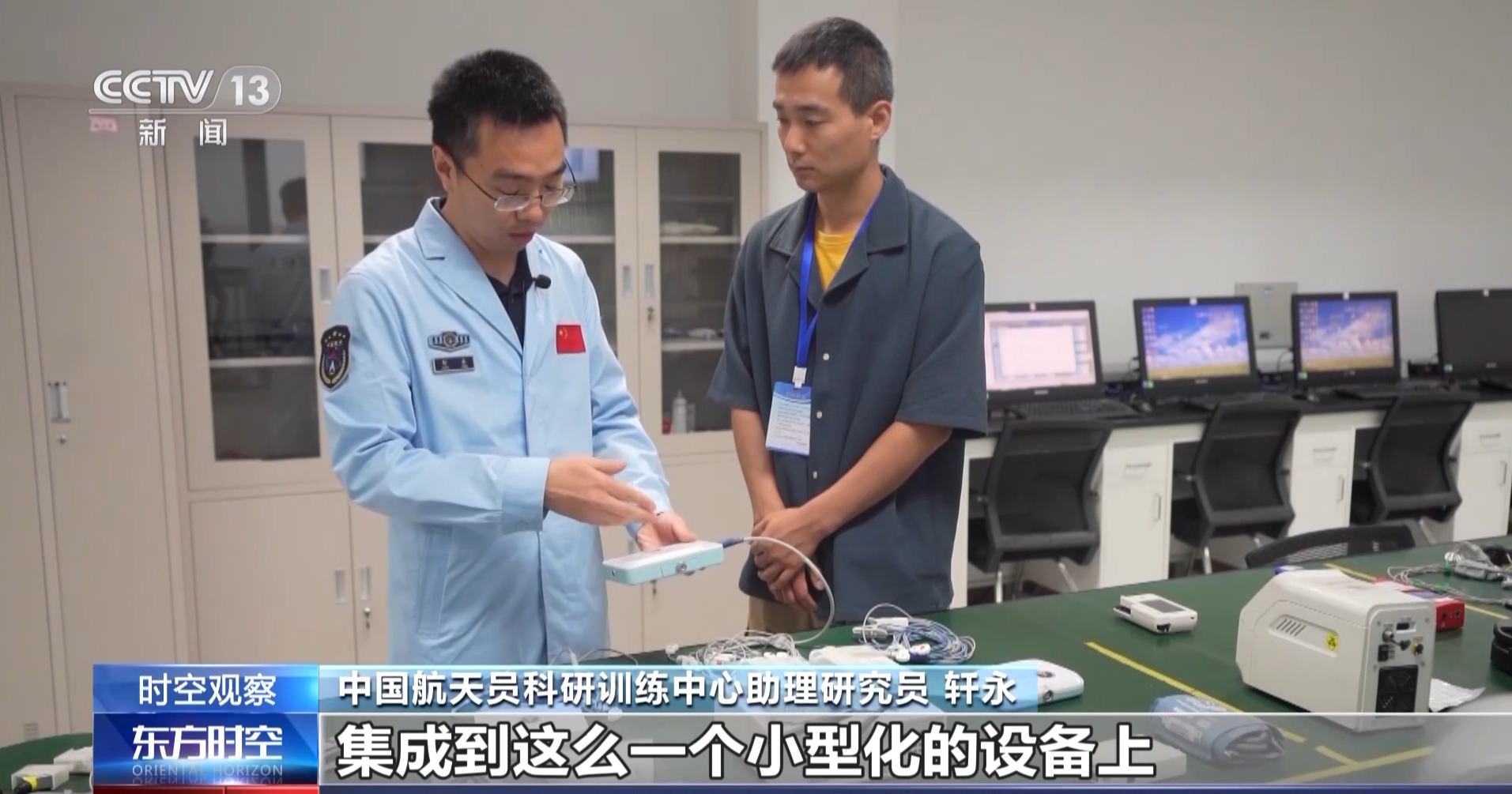 中国航天员科研训练中心助理研究员 轩永:我们做了一个高度集成化的设计,这个就是我们的12导心电仪,它集成了常规的12导心电、运动心电、心电holter(动态心电图)、急救心电4种设备,通过集成化设计,集成到这么一个小型化设备上来。