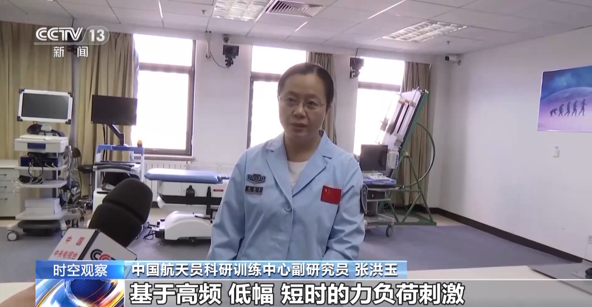 中国航天员科研训练中心副研究员 张洪玉:这个设备主要基于高频、低幅、短时的力负荷刺激,增强骨内细胞的活性。放在小腿胫骨,对它进行力学刺激,提高骨内营养分子流动,提高成骨细胞活性,来达到增加骨质骨量的目的。对机体胫骨位置击打,对整个下肢机体都是一种保护。