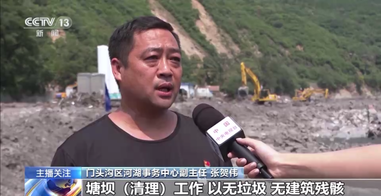 总台记者 邵薇:在北京市门头沟区大台街道办事处,我身后正在进行的是永定河山峡段的河道清理工作。8至9辆的大型工程车辆正在进行作业,他们会将清理出来河道堆积的生活垃圾、建筑残骸以及倒伏树木通过垃圾转运车转运到指定地点进行处理。这也是灾后防疫以及处理被污染河道环境的重要一环。除此之外,北京目前仍处在汛期阶段,对于河道的清理工作,通过大型机械车辆将渣土碎石推向河道的两边,保证河道底部的平整,也是一定程度上保障河道行洪畅通。
