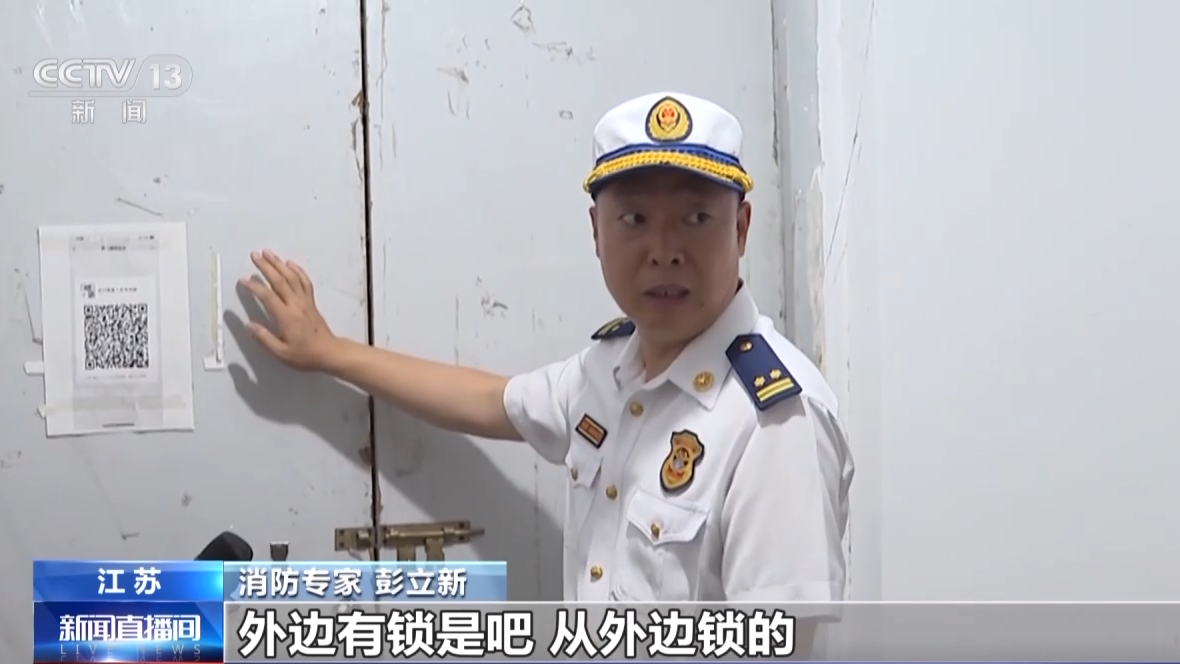 记者随检查组沿着堆满杂物的疏散楼梯好不容易走到一楼,却发现原本提供给人们在紧急情况下进行逃生疏散的通道,竟然被从外锁住。