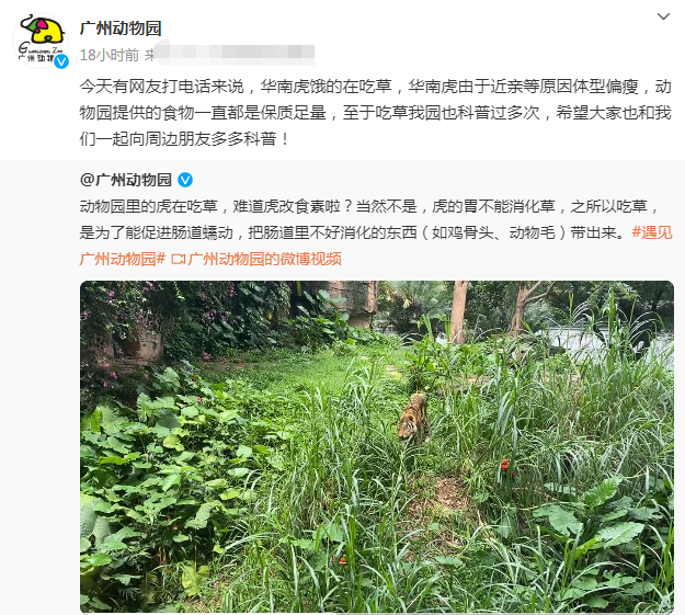 广州动物园官方微博则发文指出,华南虎由于近亲等原因体型偏瘦,动物园提供的食物一直都是保质足量。博文写道:“动物园里的虎在吃草,难道虎改食素啦?当然不是,虎的胃不能消化草,之所以吃草,是为了能促进肠道蠕动,把肠道里不好消化的东西(如鸡骨头、动物毛)带出来。”