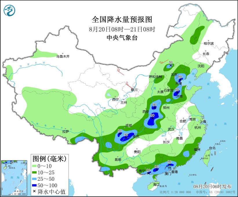 预计20日至22日,我国中东部大部地区将先后出现明显降雨,其中强降雨分布较为分散,西南地区、华北、黄淮、东北等地都有可能出现大到暴雨,局地大暴雨;上述部分地区并伴有短时强降雨、雷暴大风或冰雹等强对流天气。为此,中央气象台今晨同时发布了暴雨蓝色预警和强对流天气蓝色预警。需要特别注意的是,本次降雨过程波及到的华北、东北等地由于前期降雨偏多,土壤含水量饱和,部分中小河流水位偏高,要注意防范降雨可能带来的次生地质灾害。