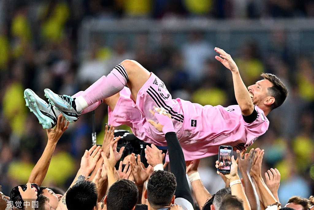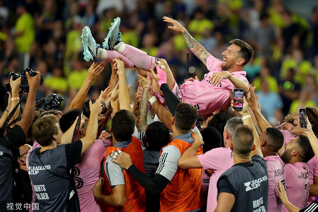 虽然在下半场被对手扳平比分,但迈阿密国际还是在点球大战中击败对手,双方一度罚到了门将各自出场,最终纳什维尔队门将罚丢——梅西也在全场“MVP”的呼喊中,赢得了自己职业生涯的第44个冠军和第29个赛事金靴。