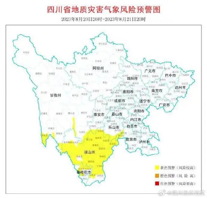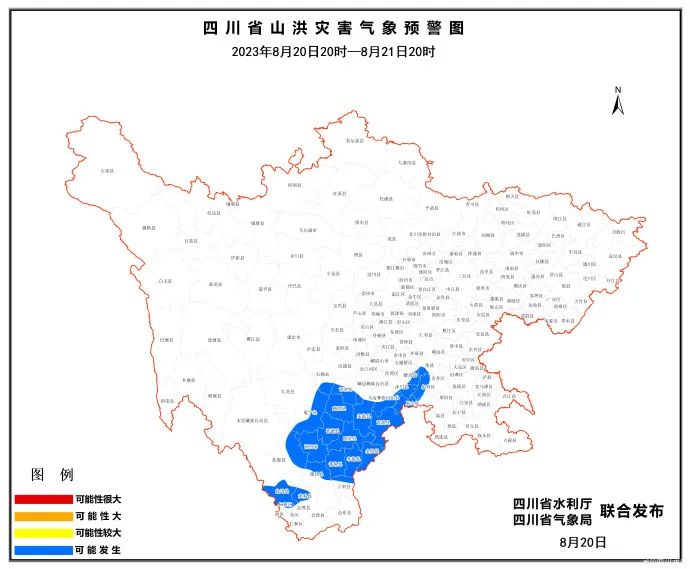 2023年8月20日20时至21日20时,乐山市犍为、沐川、峨边、马边,攀枝花市仁和、米易、盐边,自贡市荣县,宜宾市叙州、屏山,凉山州西昌、盐源、德昌、宁南、普格、布拖、金阳、昭觉、喜德、冕宁、越西、甘洛、美姑、雷波,雅安市石棉 等25个县(市、区)可能发生山洪灾害。
