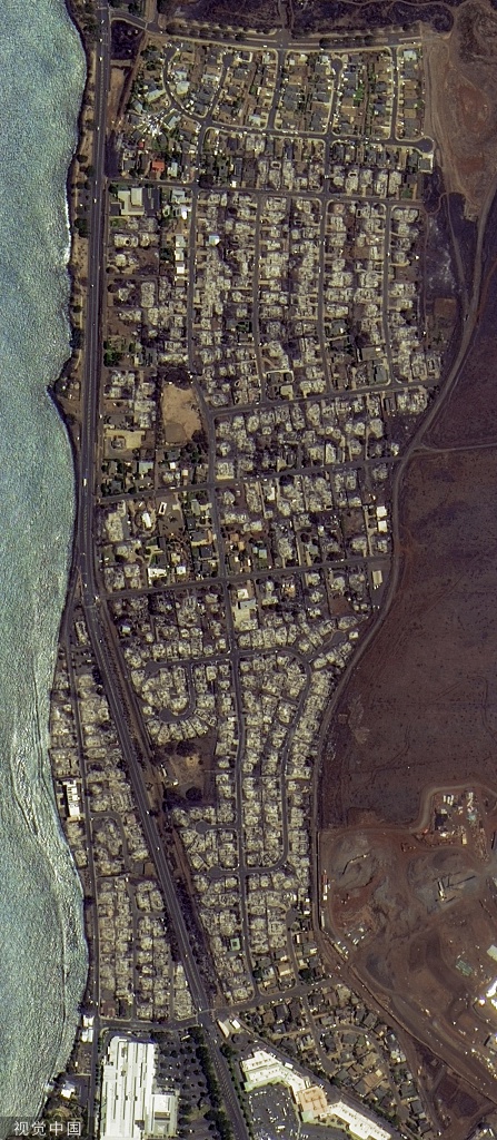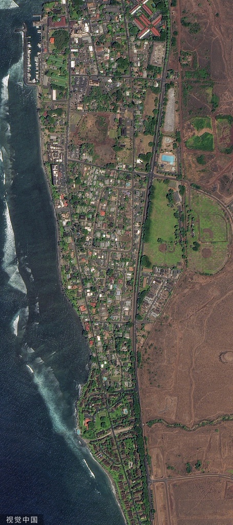 野火对当地环境造成了严重损害,从卫星图看,曾经绿意盎然的毛伊岛拉海纳镇在野火后失去了颜色,从高空看仿佛生锈一般。镜头拉近,这座度假小镇满目疮痍。
