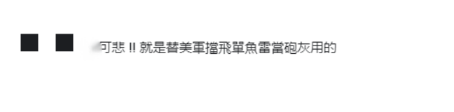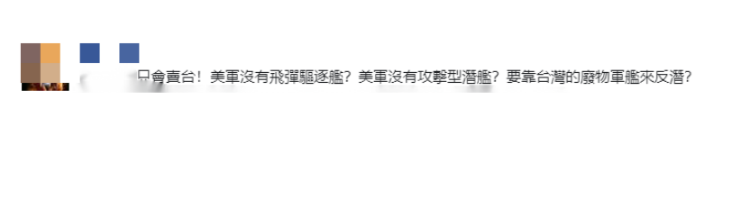 对于上述言论,有岛内网民在台媒评论区留言讽刺称,“可悲!就是替美军挡导弹鱼雷当炮灰用的”。