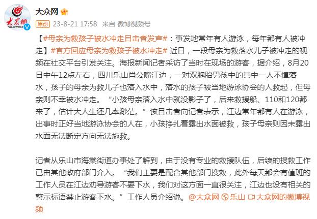 近日,一段母亲为救落水儿子被冲走的视频在社交平台引发关注。海报新闻记者采访了当时在现场的游客,据介绍,8月20日中午12点左右,四川乐山肖公嘴江边,一对双胞胎男孩中的其中一人不慎落水,孩子的母亲为救儿子也落入水中,落水的孩子被当地游泳协会的人救起,但母亲则不幸被水冲走。“小孩母亲落入水中就没影子了,后来救援船、110和120都来了,估计大人生还几率渺茫。”该目击者向记者表示,江边常年都有人在游泳,出事时正好当地游泳协会的人在,小孩挣扎着露出水面被救,孩子母亲则因未露出水面无法断定方向无法施救。