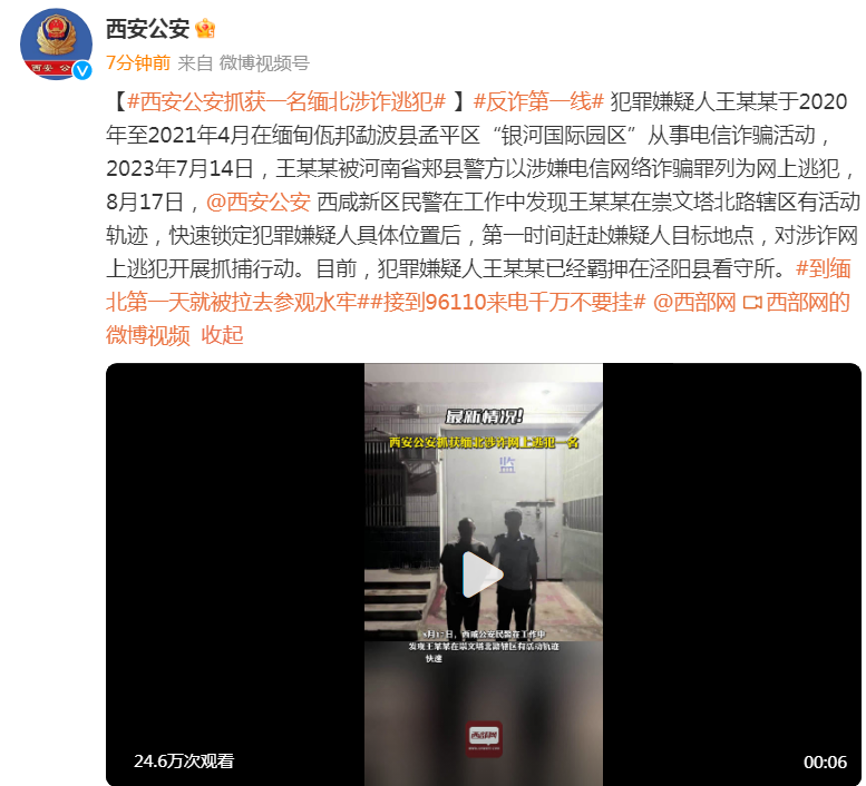 犯罪嫌疑人王某某于2020年至2021年4月在缅甸佤邦勐波县孟平区“银河国际园区”从事电信诈骗活动,2023年7月14日,王某某被河南省郏县警方以涉嫌电信网络诈骗罪列为网上逃犯,8月17日,@西安公安 西咸新区民警在工作中发现王某某在崇文塔北路辖区有活动轨迹,快速锁定犯罪嫌疑人具体位置后,第一时间赶赴嫌疑人目标地点,对涉诈网上逃犯开展抓捕行动。目前,犯罪嫌疑人王某某已经羁押在泾阳县看守所。