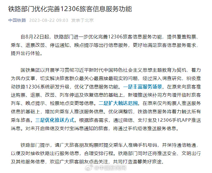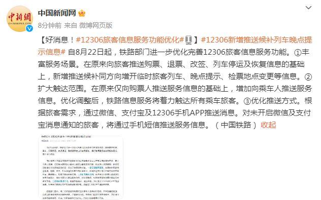 自8月22日起,铁路部门进一步优化完善12306旅客信息服务功能。①丰富服务场景。在原来向旅客推送购票、退票、改签、列车停运及恢复信息的基础上,新增推送候补同方向增开临时旅客列车、晚点提示、检票地点变更等信息。②扩大触达范围。在原来仅向购票人推送服务信息的基础上,增加向乘车人推送服务信息。优化调整后,铁路信息服务将着力触达所有乘车旅客。③优化推送方式。根据旅客需求,通过微信、支付宝及12306手机APP推送消息。对未开启微信及支付宝消息通知的旅客,将通过手机短信推送服务信息。