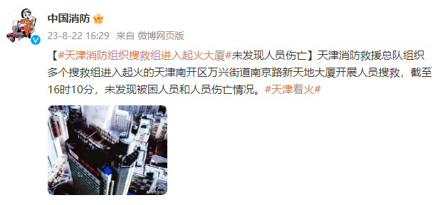 天津消防救援总队组织多个搜救组进入起火的天津南开区万兴街道南京路新天地大厦开展人员搜救,截至16时10分,未发现被困人员和人员伤亡情况。