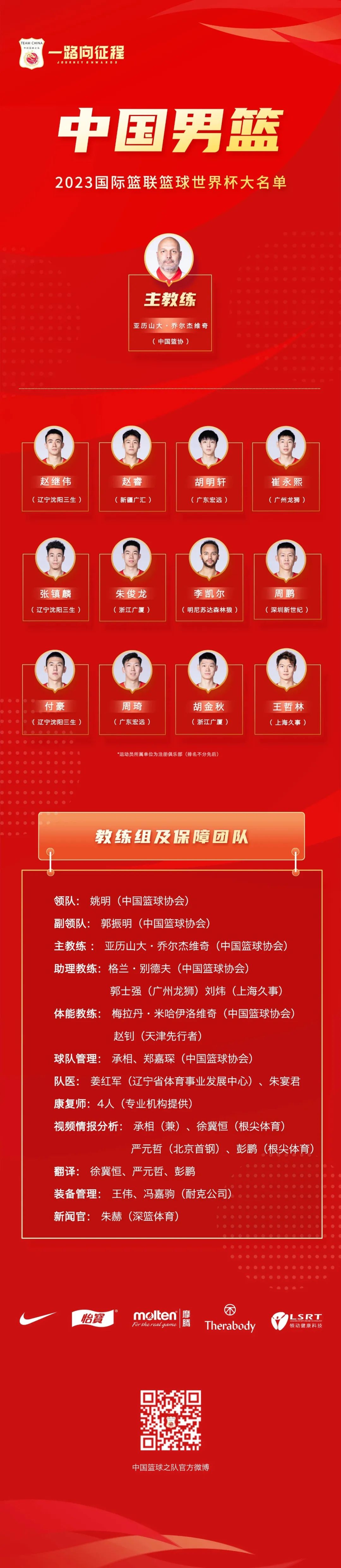 中国男篮2023年国际篮联篮球世界杯参赛名单公布