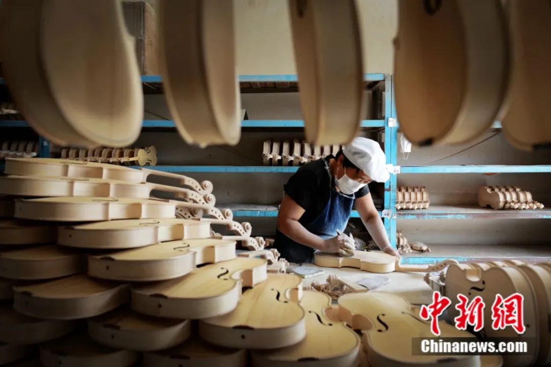 两年来,陈霞每天重复同样的动作:弯着腰,手持电动螺丝机给乐器上琴弦。她说:“力道很重要,稍微一点差池就会影响音质。这份工作就是熟能生巧,现在完全是凭感觉,一天可以安装三四十把提琴的琴弦。”