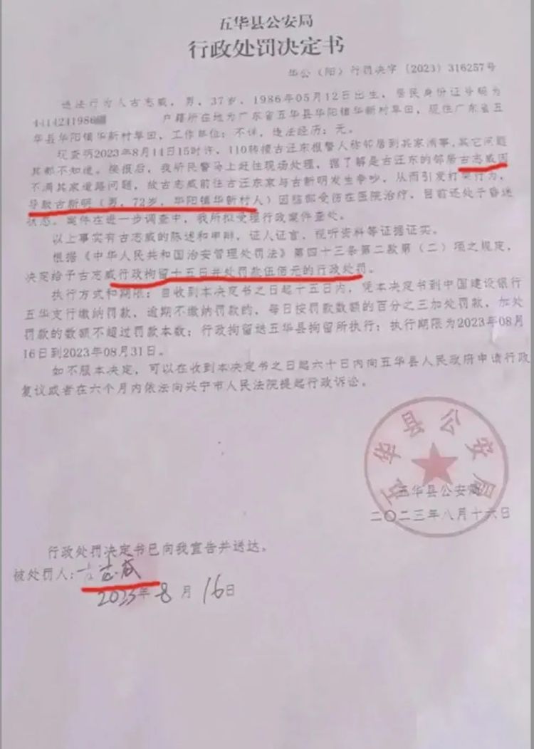 五华县公安局8月16日作出的《行政处罚书》显示,经警方了解,古某东的邻居古某威不满其家道路问题,古某威前往古某东家与古某明发生争吵,从而引发打架行为,导致古某明受伤住院,目前还处于昏迷状态。案件在进一步调查中。据此,五华县公安局决定给予古某威行政拘留十五日并处罚500元的行政处罚。