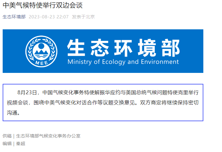8月23日,中国气候变化事务特使解振华应约与美国总统气候问题特使克里举行视频会谈,围绕中美气候变化对话合作等议题交换意见。双方商定将继续保持密切沟通。