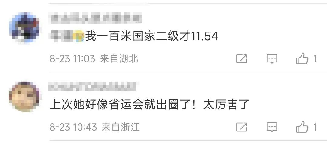 两天后进行的200米比赛中,她又跑出了23秒61的成绩,达到运动健将标准。据媒体报道,在同一天进行的全国田径大奖赛中,女子200米项目冠军得主是代表中国队参加过东京奥运会女子4×100米接力的黄瑰芬,夺冠成绩为23秒73。