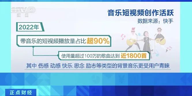 平台数据显示,2022年带音乐短视频播放量占比超90% ;使用量超过100万的歌曲达到近1800首。其中,伤感、动感、快乐、思念、励志等类型的背景音乐更受用户青睐。