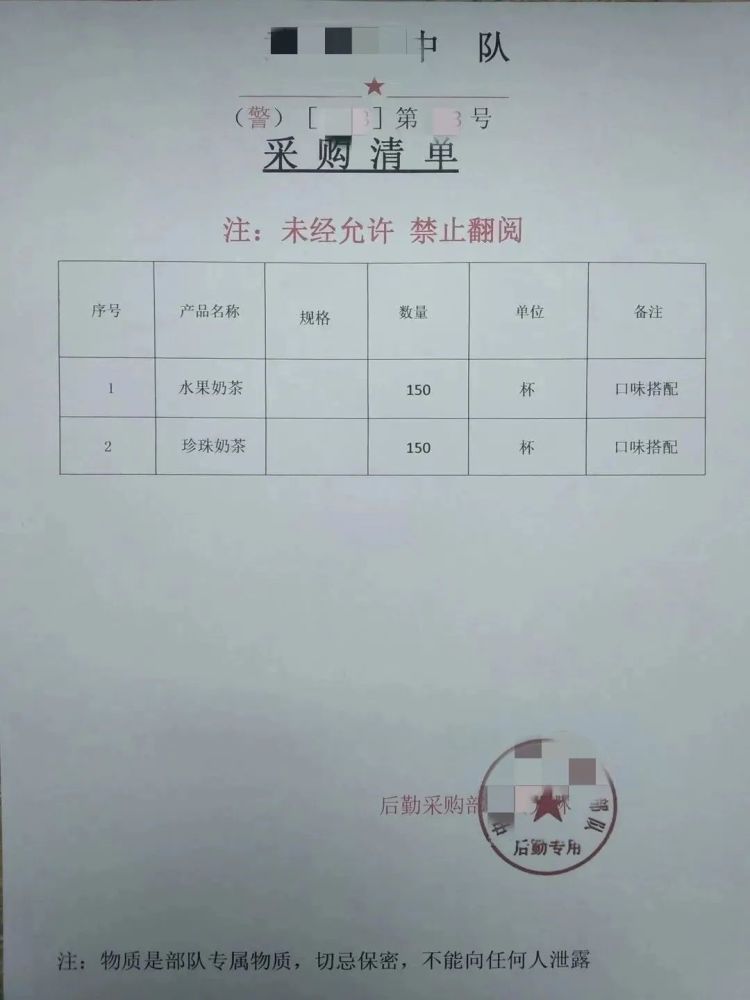随后,“黄干事”发来一份“采购清单”,“水果奶茶150杯,珍珠奶茶150杯”,署名为“中国人民武装警察部队后勤采购部”。