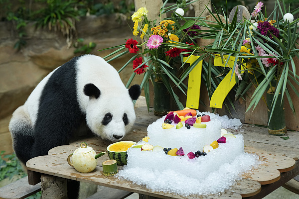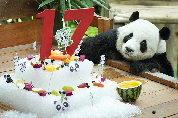 马来西亚国家动物园8月23日为中国旅马的一对大熊猫“兴兴”“靓靓”庆祝17岁生日。