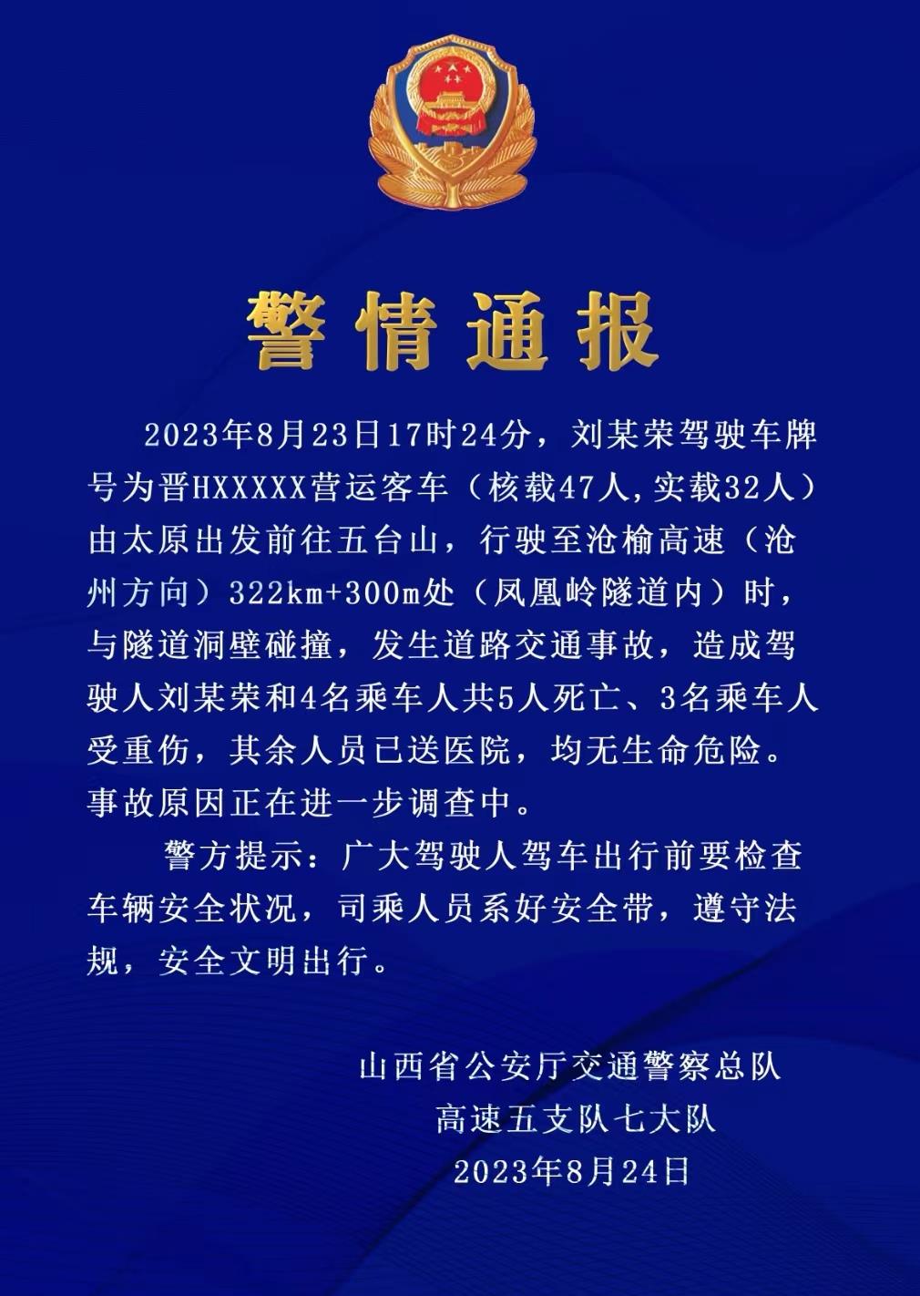 8月24日,山西省公安厅交通警察总队高速五支队七大队对外通报沧榆高速“8·23”道路交通事故警情:2023年8月23日17时24分,刘某荣驾驶车牌号为晋HXXXXX营运客车(核载47人,实载32人)由太原出发前往五台山,行驶至沧榆高速(沧州方向)322km+300m处(凤凰岭隧道内)时,与隧道洞壁碰撞,发生道路交通事故,造成驾驶人刘某荣和4名乘车人共5人死亡、3名乘车人受重伤,其余人员已送医院,均无生命危险。事故原因正在进一步调查中。
