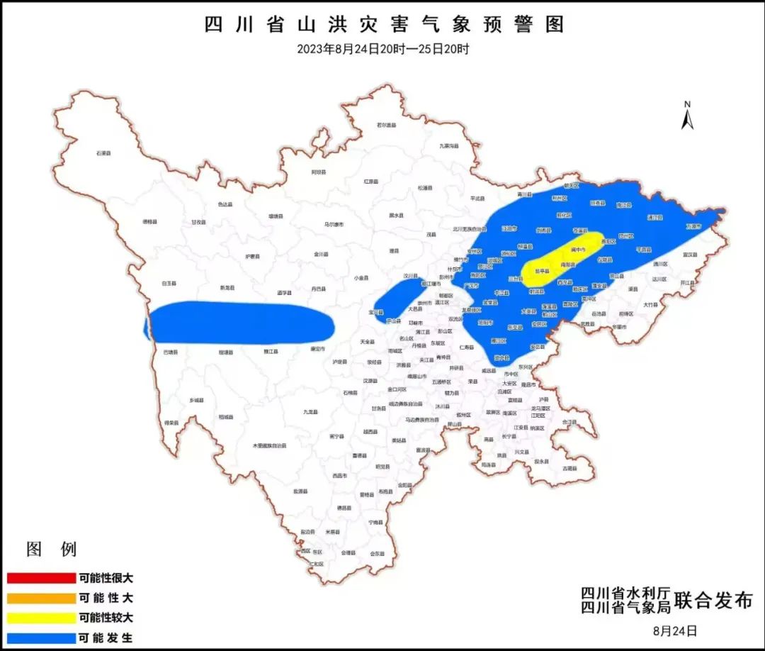 预警信息显示:8月24日20时至25日20时,广元苍溪,巴中恩阳,南充南部、仪陇、西充、阆中,遂宁射洪,绵阳三台、盐亭等9个县(市、区)发生山洪灾害可能性较大(黄色);