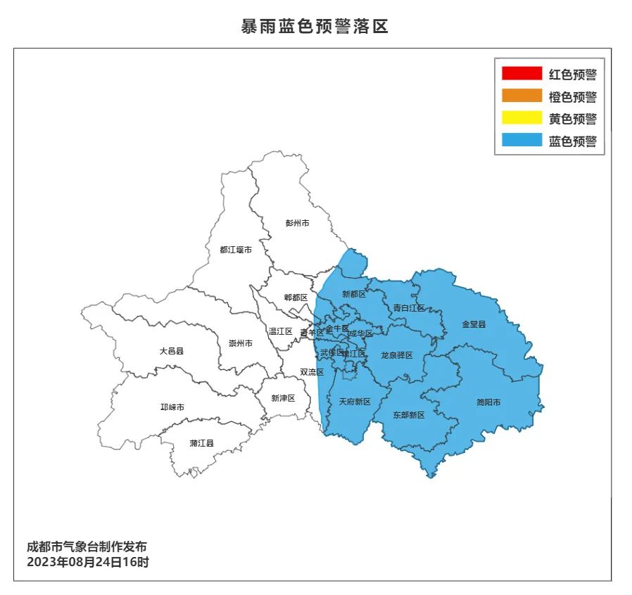 此外,成都市气象台也发布了暴雨蓝色预警:预计今天傍晚到明天白天成都市阴天有中到大雨,其中主城区、新都、龙泉驿、青白江、金堂、简阳、成都东部新区和四川天府新区 的部分地方有暴雨(雨量50~80毫米),最大小时雨强20~30毫米,其余区(市)县个别地方暴雨,降雨时伴有6级以上阵性大风。