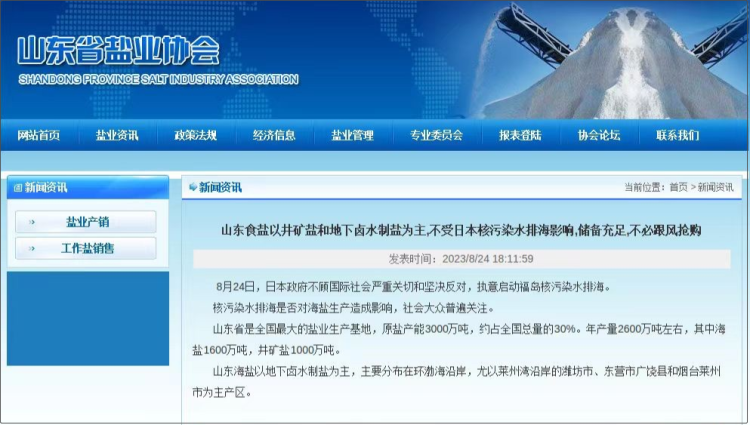 8月24日傍晚,山东省盐业协会官网发布信息称,山东省所产食盐以井矿盐和地下卤水制盐为主,不受日本核污染水排海影响,且储备充足,市民不必跟风抢购。 全文如下: