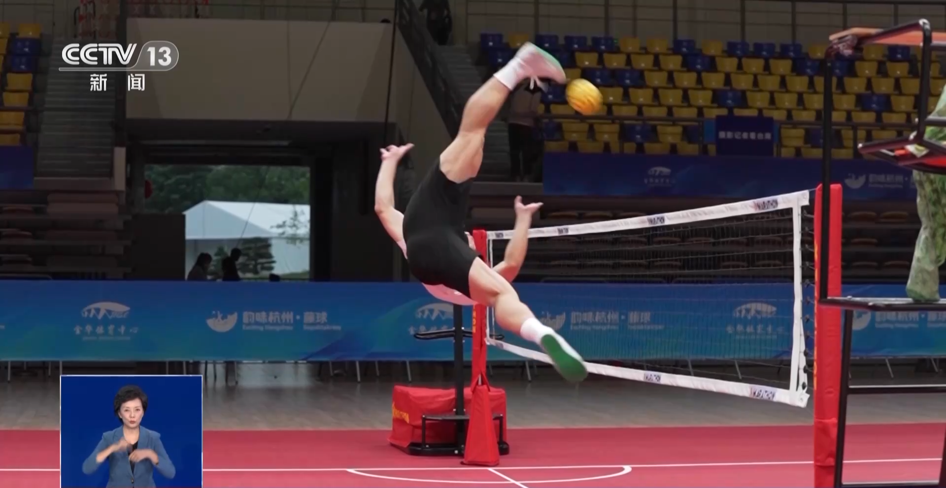 金华体育中心场馆群运行团队藤球项目竞赛副指挥长 袁华:用脚在这个高度把球扣到对方场地上,需要很高超的技艺和很好的弹跳能力。像外掰、跨打、半转体、转体这样的动作,非常耗体能,所以一个优秀的藤球主攻,一场球如果真打满两三局的话,他需要扣五六十次,就是做五六十个空翻。