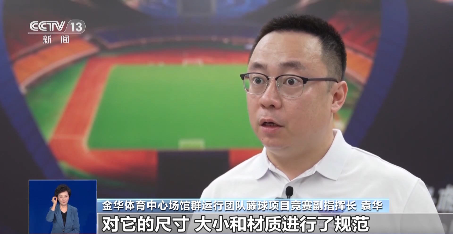 金华体育中心场馆群运行团队藤球项目竞赛副指挥长 袁华:藤球最初的确是藤蔓编制的,后来为了在正式比赛中使用,国际藤联和亚藤联对它的尺寸、大小和材质进行了规范,使器材能够符合它的技术特点,又保证藤球的传统性。现在我们的标准藤球是以塑料为骨架编制而成的。它和排球、足球最大的一个不同是在于它本身不充气,它的内部是镂空的,弹性来自本身塑料结构编织而成的弹性。