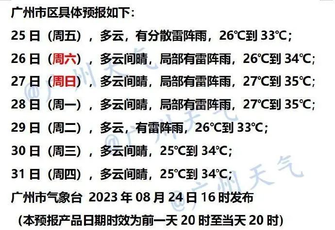 25日,南部市县多云,有雷阵雨,局部暴雨,其余大部分市县晴到多云,午后有分散雷阵雨。最高气温:南部沿海市县31℃~33℃,其余市县34℃~36℃。