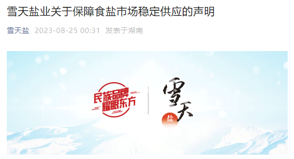 8月25日凌晨,雪天盐业集团发布《雪天盐业关于保障食盐市场稳定供应的声明》。
