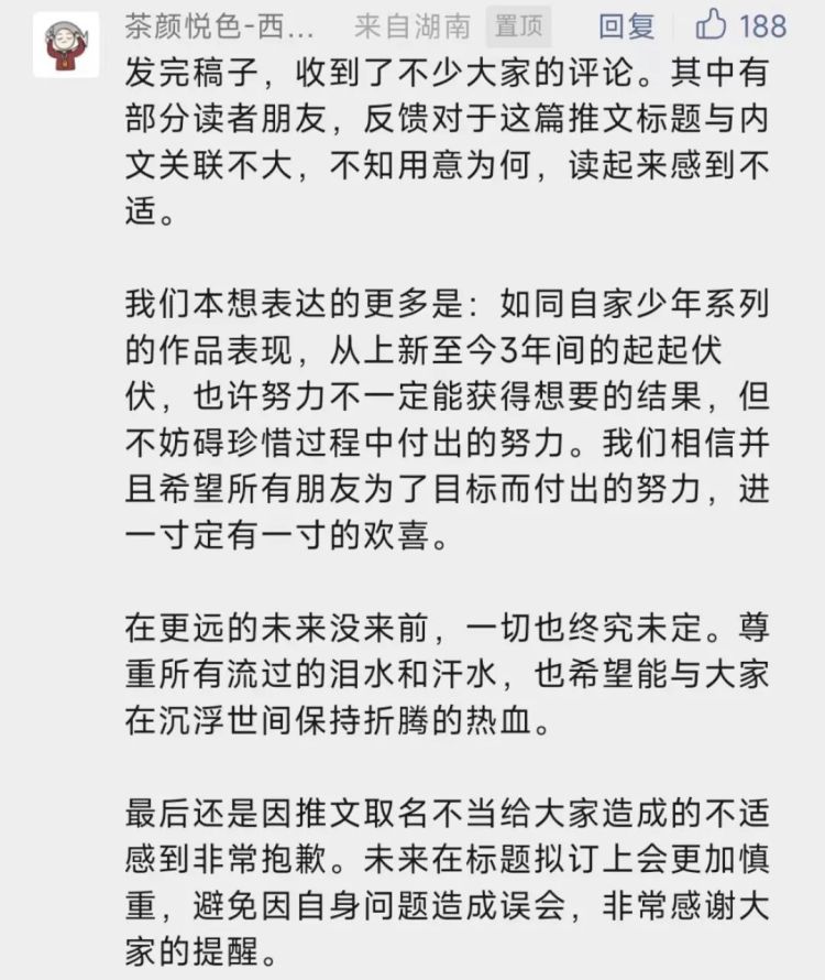 对于引发的种种争议,茶颜悦色在推文留言区回应称:“本想表达的更多是,如同自家少年系列的作品表现,从上新至今3年间的起起伏伏,也许努力不一定能获得想要的结果,但不妨碍珍惜过程中付出的努力。我们相信并且希望所有朋友为了目标而付出的努力,进一寸定有一寸的欢喜。”