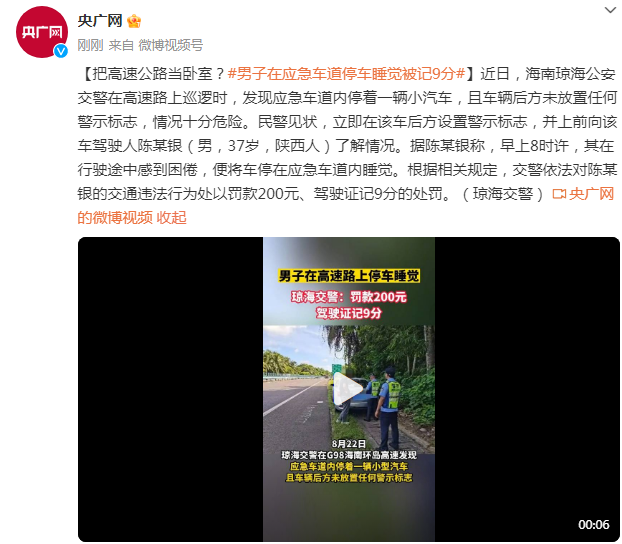 近日,海南琼海公安交警在高速路上巡逻时,发现应急车道内停着一辆小汽车,且车辆后方未放置任何警示标志,情况十分危险。民警见状,立即在该车后方设置警示标志,并上前向该车驾驶人陈某银(男,37岁,陕西人)了解情况。据陈某银称,早上8时许,其在行驶途中感到困倦,便将车停在应急车道内睡觉。根据相关规定,交警依法对陈某银的交通违法行为处以罚款200元、驾驶证记9分的处罚。