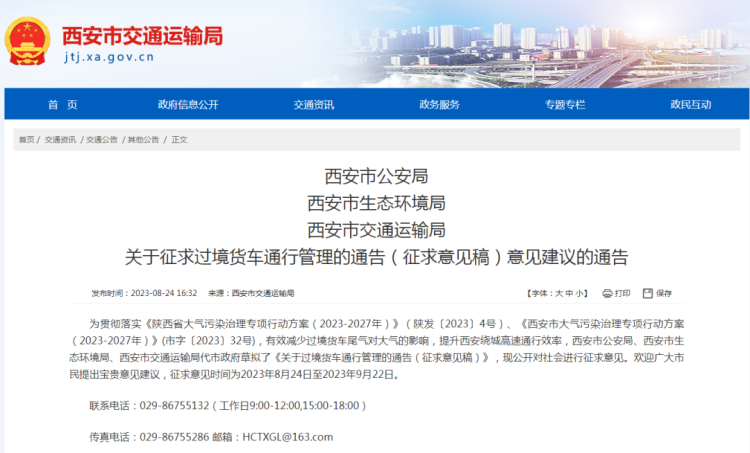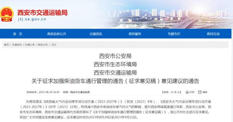 通告中称,为贯彻落实《陕西省大气污染治理专项行动方案(2023-2027年)》、《西安市大气污染治理专项行动方案(2023-2027年)》,有效减少西安市柴油货车尾气、过境货车尾气对大气的影响,提升绕城高速通行效率,西安市公安局、西安市生态环境局、西安市交通运输局代市政府草拟征求意见稿,公开面向社会进行征求意见,征求意见时间为2023年8月24日至2023年9月22日。