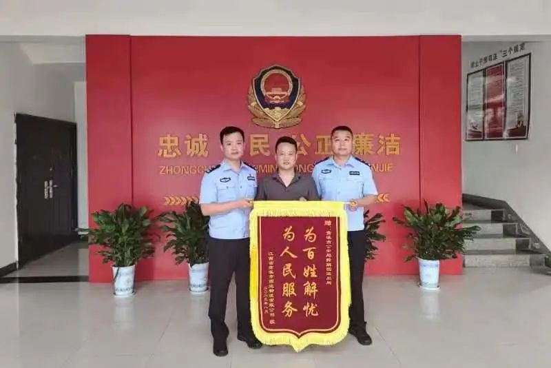 8月25日,贵溪某企业负责人来到贵溪市公安局铜拆解园派出所赠送锦旗,激动地握着民警的手说道。