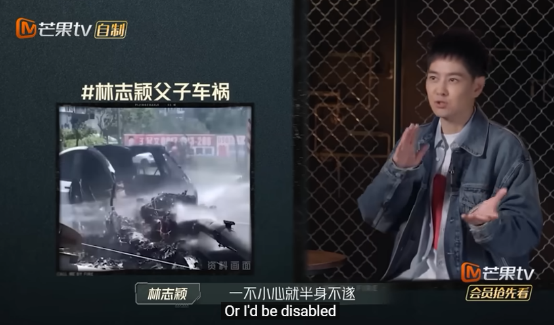 报道称,林志颖发生车祸时,差0.1秒就火烧车,当时路人拉出他和儿子,生死一瞬间。他在节目中说到他和儿子那0.1秒的惊险一度哽咽,称“发生这样的事情,如果他有什么事情,我怎么去过我的未来,还好是我受伤,如果是他受伤,我想没有办法接受。”
