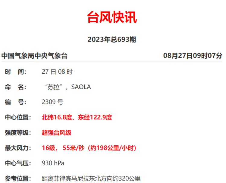 据中央气象台消息,今年第9号台风“苏拉”已于昨天(26日)夜间由强台风级加强为超强台风级 。