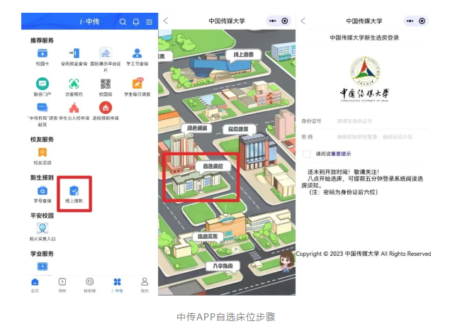 该校线上自选床位有中传APP及电脑端两种途径,点击“自选床位”进入选房系统后,需进行信息核对与采集,提交后才能进入选房界面选择宿舍和床位。