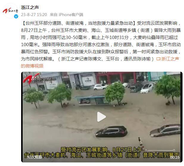 受对流云团发展影响,8月27日上午,台州玉环市大麦屿、海山、玉城街道等乡镇(街道)普降大雨到暴雨,局地小时雨强可达30-50毫米,截止上午10时31分,大麦屿仙叠降雨已超过100毫米。强降雨导致当地部分河道水位激涨,部分道路、街道被淹,玉环市启动暴雨红色预警。玉环市消防救援大队在接到群众报警后,第一时间紧急出动救援,为市民排忧解难。(浙江之声记者陈博文、玉环台,通讯员陈诗瑜)