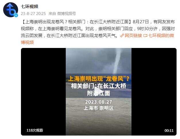 8月27日,有网友发布视频称,在上海崇明看见龙卷风。对此,崇明相关部门回应,9时30分许,因强对流云团发展,在长江大桥附近江面出现龙卷风天气。