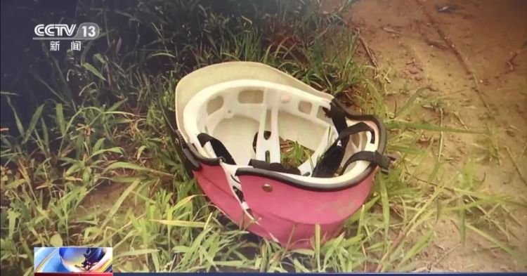事故现场照片显示,这顶头盔没有缓冲层,撞击过后,头盔壳体破了一个大洞,佩戴装置也被甩脱。