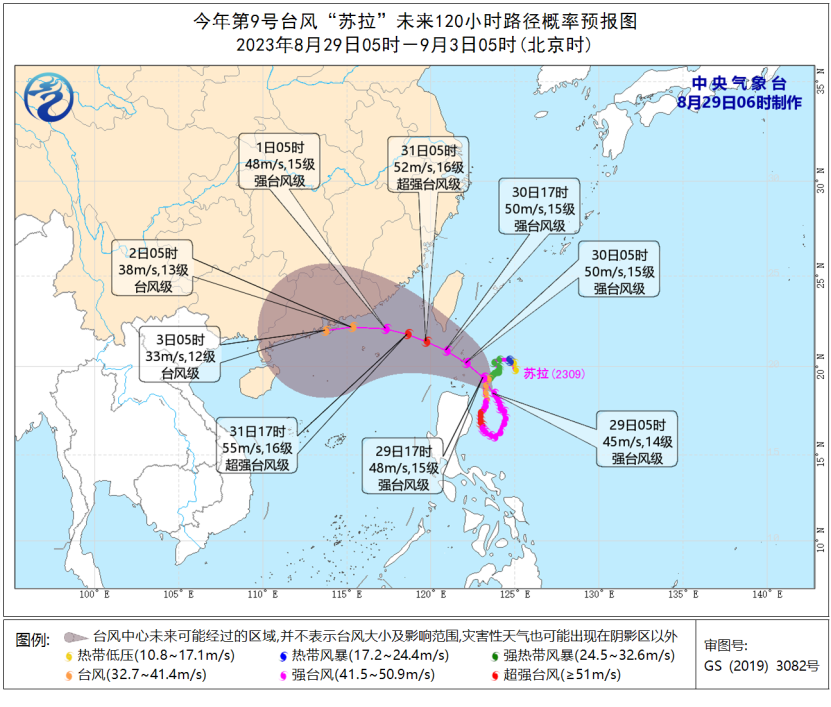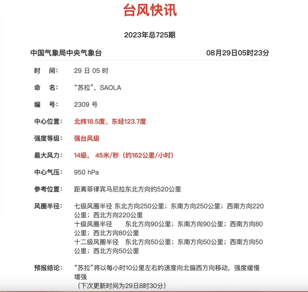 今年第9号台风“苏拉”(SAOLA)(强台风级)的中心今天(29日)早晨5点钟位于菲律宾马尼拉东北方向约520公里的海面上,就是北纬18.5度、东经123.7度,中心附近最大风力有14级(45米/秒),中心最低气压为950百帕,七级风圈半径220~250公里,十级风圈半径80~90公里,十二级风圈半径50公里。