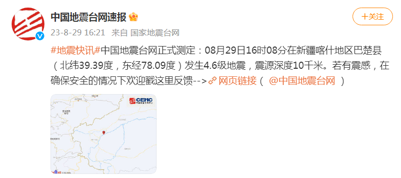 中国地震台网正式测定:08月29日16时08分在新疆喀什地区巴楚县(北纬39.39度,东经78.09度)发生4.6级地震,震源深度10千米。