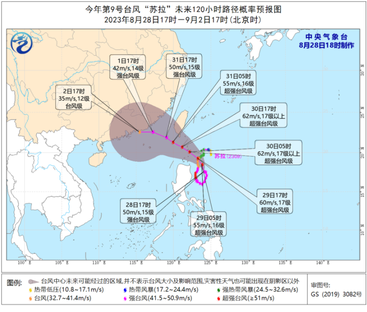 预计,“苏拉”将于31日早晨移入南海东北部海面,强度将再次增强,并逐渐向福建南部到广东东部一带沿海靠近,有可能于9月1日夜间到2日上午在广东东部一带沿海登陆(台风级或强台风级,35-42米/秒,12-14级),也有可能在广东东部近岸海面向西偏南方向移动。8月29日14时至30日14时,巴士海峡、台湾海峡、台湾以东洋面偏南海域将有6-8级、阵风9-10级的大风,其中巴士海峡海域风力可达9-10级,部分海域风力可达11-13级,“苏拉”中心经过的附近海面的风力有14-16级、阵风17级及以上。