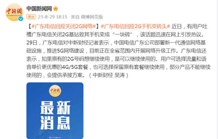 近日,有用户吐槽广东电信关闭2G基站致其手机变成“一块砖”,该话题迅速在网上引发热议。29日,广东电信对中新财经记者表示,中国电信广东公司部署新一代通信网络基础设施,推进5G网络建设,目前正在全省范围内开展网络升级工作。广东电信还表示,如果原有的2G号码想继续使用,是可以继续使用的。用户可选择流量和语音单价更优惠的4G/5G套餐,也可选择保留原有套餐继续使用,部分产品不能继续使用的,会提供承接方案。(中新财经 吴涛)